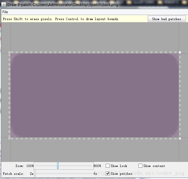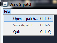 打开我们的draw9patch.bat,点击左上角File,来到对应目录打开我们要处理的图片素材, 接下来就可以看到我们工具的主界面了: