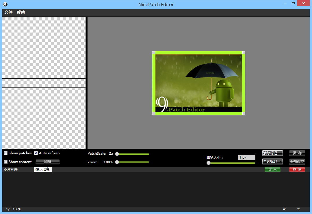 ②NinePatchEditor,相比起自带的,做了一些优化,支持批量操作,而且界面看起来美观一点: 有兴趣的可以下载下,笔者平时用的这个,下载链接:NinePatchEditor.zip