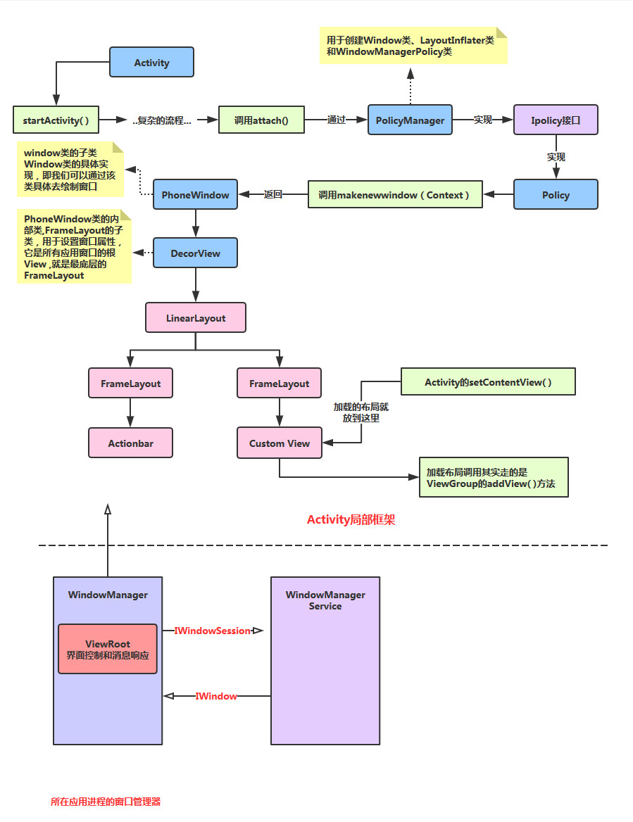 流程解析: Activity调用startActivity后最后会调用attach方法,然后在PolicyManager实现一个Ipolicy接口,接着实现一个Policy对象,接着调用makenewwindow(Context)方法,该方法会返回一个PhoneWindow对象,而PhoneWindow 是Window的子类,在这个PhoneWindow中有一个DecorView的内部类,是所有应用窗口的根View,即View的老大, 直接控制Activity是否显示(引用老司机原话..),好吧,接着里面有一个LinearLayout,里面又有两个FrameLayout他们分别拿来装ActionBar和CustomView,而我们setContentView()加载的布局就放到这个CustomView中!