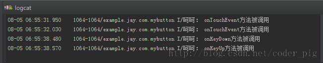 一个简单的按钮,点击按钮后触发onTouchEvent事件,当我们按模拟器上的键盘时, 按下触发onKeyDown,离开键盘时触发onKeyUp事件!我们通过Logcat进行查看!