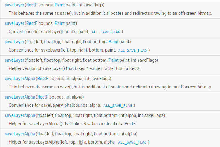 其实这两个方法和save以及restore大同小异,只是在后者的基础上多了一些东东而已, 比如saveLayer(),有下面多个重载方法: