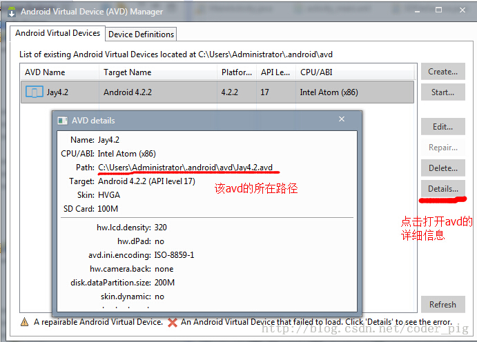 点击打开avd界面,点击detail,查看avd镜像的目录下![]()