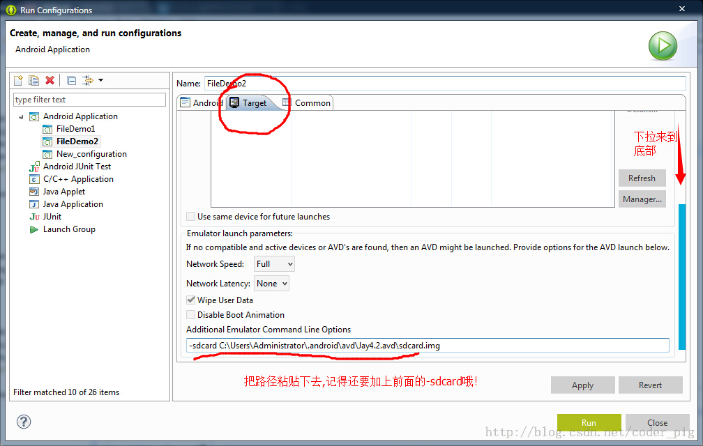 比如我的:-sdcard C:\Users\Administrator.android\avd\Jay4.2.avd\sdcard.img③接着点击