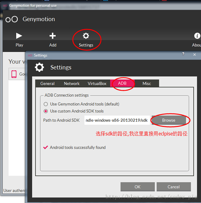 答:在下载设备驱动时其实已经下载好对应的sdk了,但是如果你不喜欢的话可以 打开setting--ADB-->选择Eclpise的sdk路径