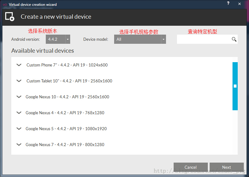 点击yes后会来到选择avd版本的界面,因为这上面什么设备都没有,我们需要连接到官网