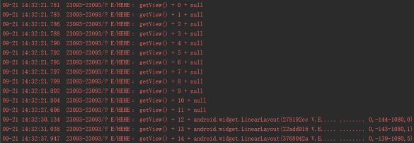 上图中有一个Recycler的东东,平时我们ListView上可见的Item处于内存中,而且他的Item则放在 这个Recycler中,第一次加载item时,当前页面中的convertView都为NULL,当滚出屏幕,这是时候 ConvertView不为空,所以新的一项会复用这个ConvertView! 我们可以写个简单的例子,跟下log,下面是运行后的一些Log图!