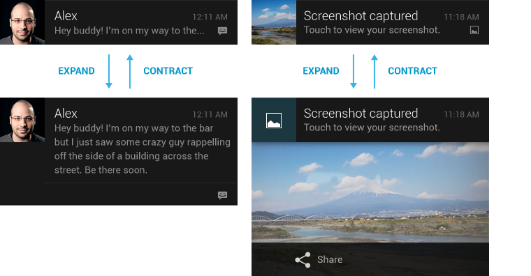 在 Jelly Bean 中你可以为通知提供更多事件的细节。你可以通过扩展布局显示消息的前几行或者图片的预览。这样用户可以看多更多的内容 - 有时甚至可以看到整个消息。用户可以通过 pinch-zoom 或者双手指滑动来打开扩展布局。Android 为单条消息提供了两种扩展布局 (文字和图像) 供你开发应用时使用。