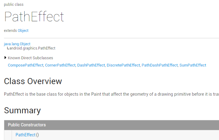 官方API文档:PathEffect 进去看文档,可以发现这个PathEffect和我们前面学的MaskFilter(面具)与ColorFilter(颜色 过滤器)一样,几乎没有可用的方法: