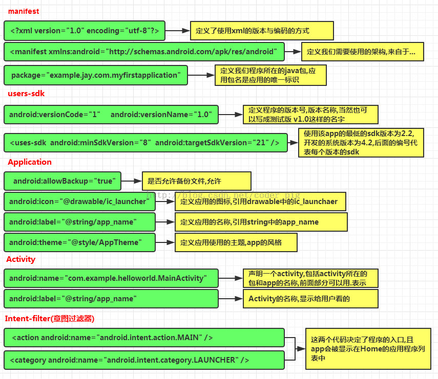 元素 BroadcastReceiver 元素 ContentProvider 元素 IntentFilter<intent-filter>元素 ②权限的声明: 在该文件中显式地声明程序需要的权限,防止app错误地使用服务, 不恰当地访问 资源,最终提高android app的健壮性 android.permission.SEND_SMS 有这句话表示app需要使用发送信息的权限,安装的时候就会提示用户, 相关权限可以在sdk参考手册查找!