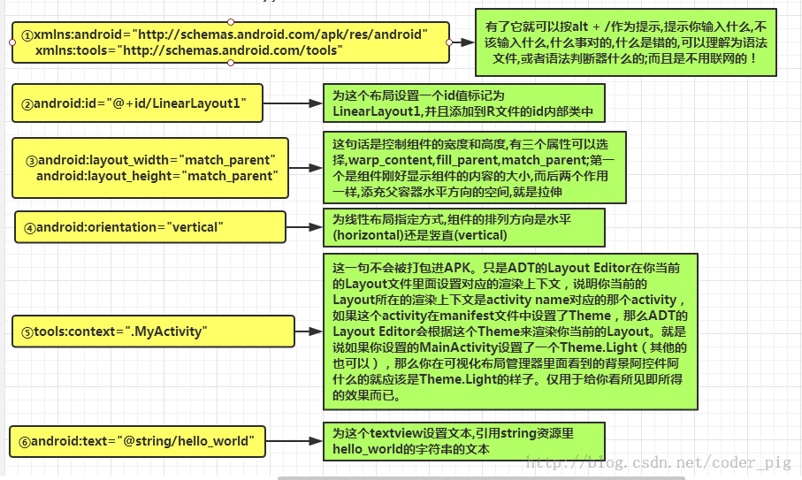 我们定义了一个LinearLayout线性布局,在xml命名空间中定义我们所需要使用的架构,来自于①