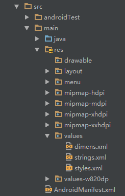 - res:存放我们各种资源文件的地方,有图片,字符串,动画,音频等,还有各种形式的XML文件