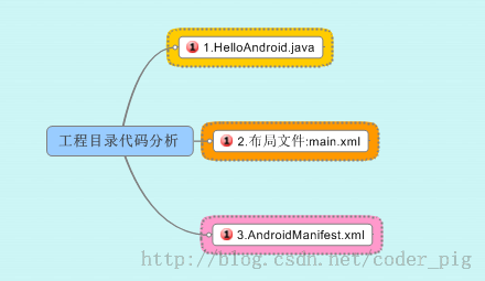 好了,接下来我们就要剖析工程里三个比较重要的文件: MainActivity.java,布局文件:activity_main和Android配置文件:AndroidManifest.xml PS:图片内容可能有点差距,没时间做图,望体谅~