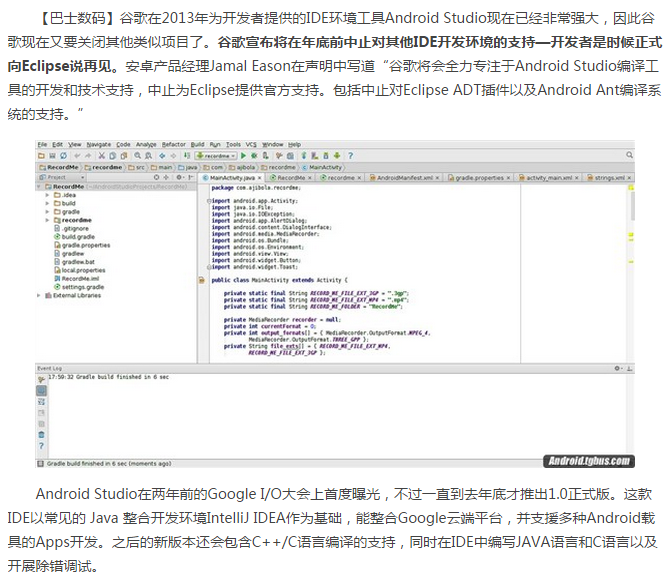 前面讲了一堆看似和我们Android开发无关的东西是吧,当然是现在看似而已,以后你回头看就知道了! 好吧,本节我们就来以前面创建的Hello World项目为入口,来了解工程结构, 以及Android中的资源访问的两种方式!后续教程使用的IDE是Android Studio,因为在前几天谷歌正式宣布,在年底前终止对其他IDE开发环境的支持!