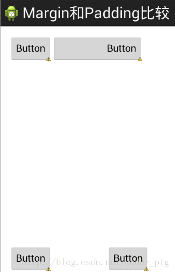 初学者对于这两个属性可能会有一点混淆,这里区分下: 首先margin代表的是偏移,比如marginleft = "5dp"表示组件离容器左边缘偏移5dp; 而padding代表的则是填充,而填充的对象针对的是组件中的元素,比如TextView中的文字 比如为TextView设置paddingleft = "5dp",则是在组件里的元素的左边填充5dp的空间! margin针对的是容器中的组件,而padding针对的是组件中的元素,要区分开来! 下面通过简单的代码演示两者的区别: