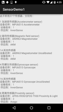 上面说的这么多种肯定不是所有手机都具备的,每台手机上搭载的传感器类型 以及数目都可能是不一样的,比如我手头上的Nexus 5支持的传感器类型有: 重力,光线,距离,气压和陀螺仪!而令意外moto x 二代则有重力,光线, 距离和红外传感器!关于自己手机支持的传感器类型,你可以到相关的评测 网站比如:中关村手机在线,太平洋等,搜索到自己的机型查看相关参数! 当然,我们也可以自己写代码来看看自己手机支持的传感器类型~
