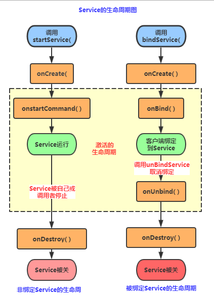 好的,从上图的生命周期,我们可以知道,Android中使用Service的方式有两种: