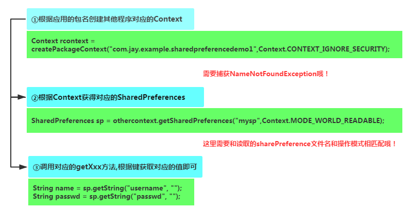 核心: 获得其他app的Context,而这个Context代表访问该app的全局信息的接口,而决定应用的唯一标识 是应用的包名,所以我们可以通过应用包名获得对应app的Context 另外有一点要注意的是:其他应用的SP文件是否能被读写的前提就是SP文件是否指定了可读或者 可写的权限,我们上面创建的是MODE_PRIVATE的就不可以了~所以说你像读别人的SP里的数据, 很难,另外,一些关键的信息,比如密码保存到SP里,一般都是会做加密的,所以只能自己写自己玩~ 等下会讲下常用的MD5加密方法!