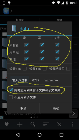 ——————重点——————: 在执行后续命令行指令之前,针对你的测试的机器可能有几种: 1.原生模拟器:那行,你跳过这里,继续往下 2.Genymotion模拟器:没戏,Genymotion Shell执行不了下述命令 3.真机(已root):那么你打开File Explorer看看data/data/目录下有东西没?没么? 下面提供一个方法,就是先装个RE文件管理器,然后授予RE Root权限,接着来到根目录: 然后长按data目录,会弹出这样的对话框: