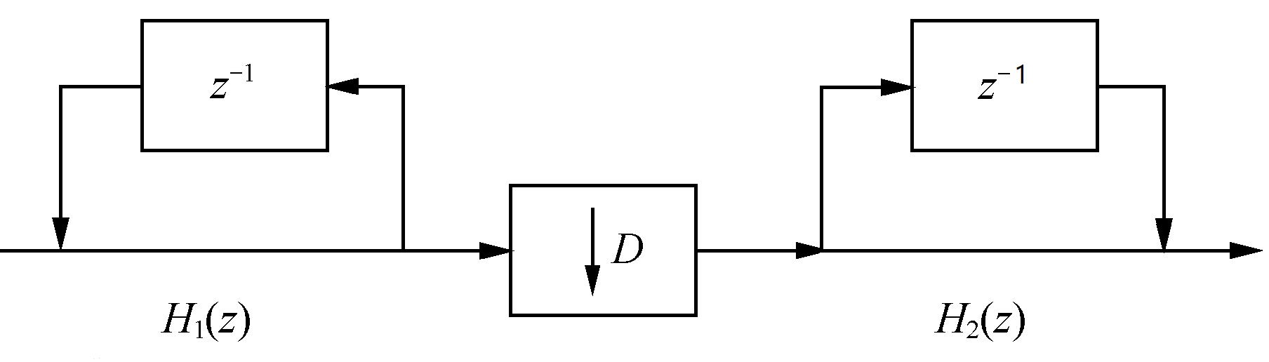 在积分器之后,还有一个抽取器,抽取倍数与梳状器的延时参数是一致的。利用 z 变换的性质进行恒等变换,将抽取器移动到积分器与梳状器之间,可得到单级 CIC 滤波器结构,如下所示。