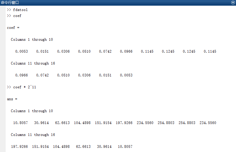 此时 coef 变量应该是浮点型数据。对其进行一定倍数的相乘扩大,然后取其近似的定点型数据作为设计中的 FIR 滤波器参数。这里取扩大倍数为 2048,结果如下所示。