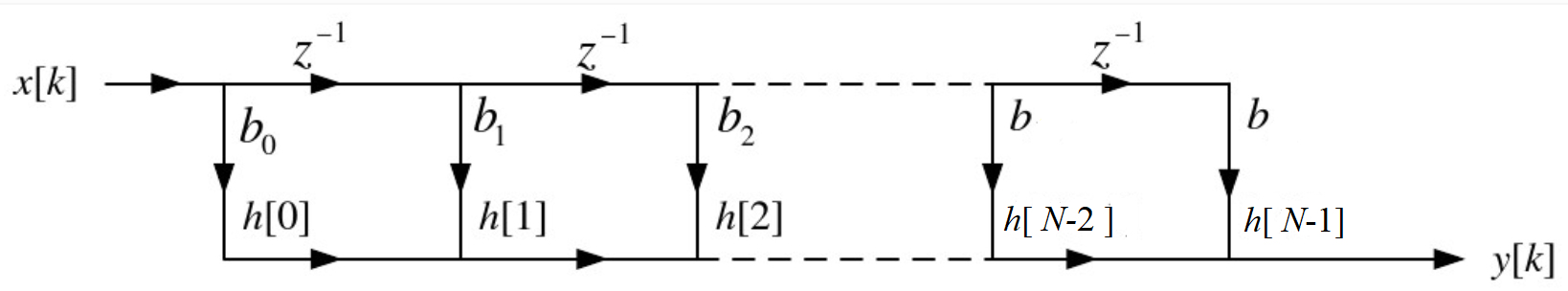 FIR 滤波器是有限长单位冲击响应滤波器。直接型结构如下: