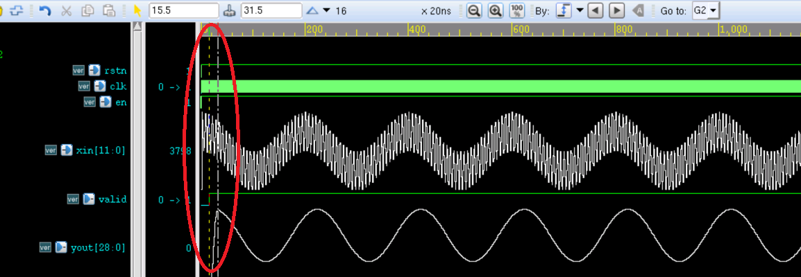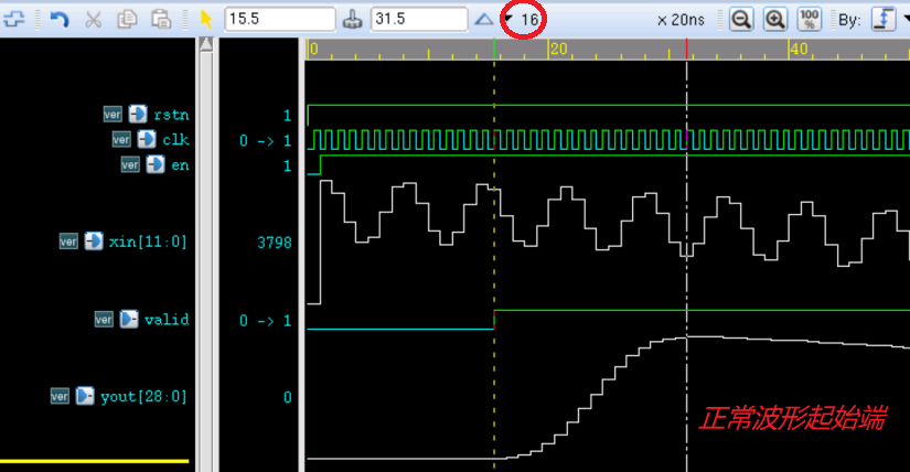 因为数据是串行输入,设计中使用了 16 组延时寄存器,所以滤波后的第一个正常点应该较第一个滤波数据输出时刻延迟 16 个时钟周期。即数据输出有效信号 valid 应该再延迟 16 个时钟周期,则会使输出波形更加完美。