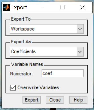 将滤波器参数输出,存到变量 coef 中,如下图所示。