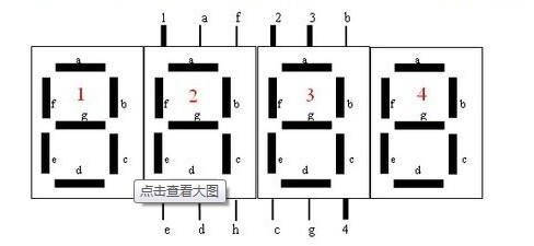 每位数码显示端有 8 个光亮控制端(如图中 a-g 所示),可以用来控制显示数字 0-9 。