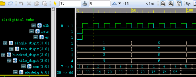 由图可知,片选、译码等信号,均符合设计。实际中,4 位数字应当在一定的时间内保持不变,而片选信号不停的循环扫描,数码管才能给肉眼呈现一种静态显示的效果。