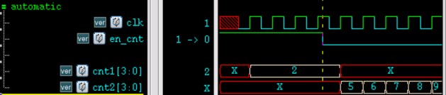 - en_cnt 为低时,任务 (2) 中信号 cnt2 能输出正确的逻辑值,任务 (1) 中信号 cnt1 的值为 X;
