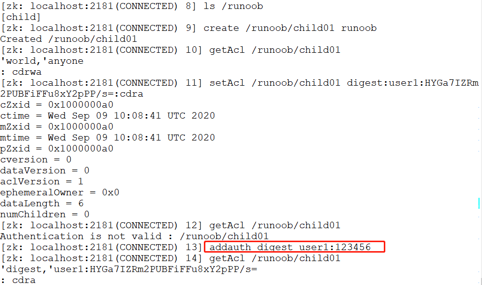 $ ls /runoob $ create /runoob/child01 runoob $ getAcl /runoob/child01 $ setAcl /runoob/child01 digest:user1:HYGa7IZRm2PUBFiFFu8xY2pPP/s=:cdra $ getAcl /runoob/child01 $ addauth digest user1:123456 $ getAcl /runoob/child01