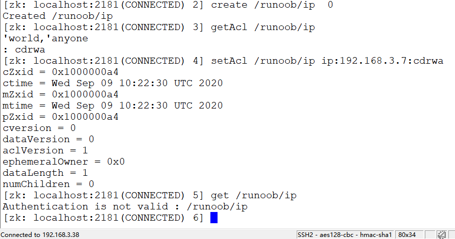 $ create /runoob/ip 0 $ getAcl /runoob/ip $ setAcl /runoob/ip ip:192.168.3.7:cdrwa $ get /runoob/ip