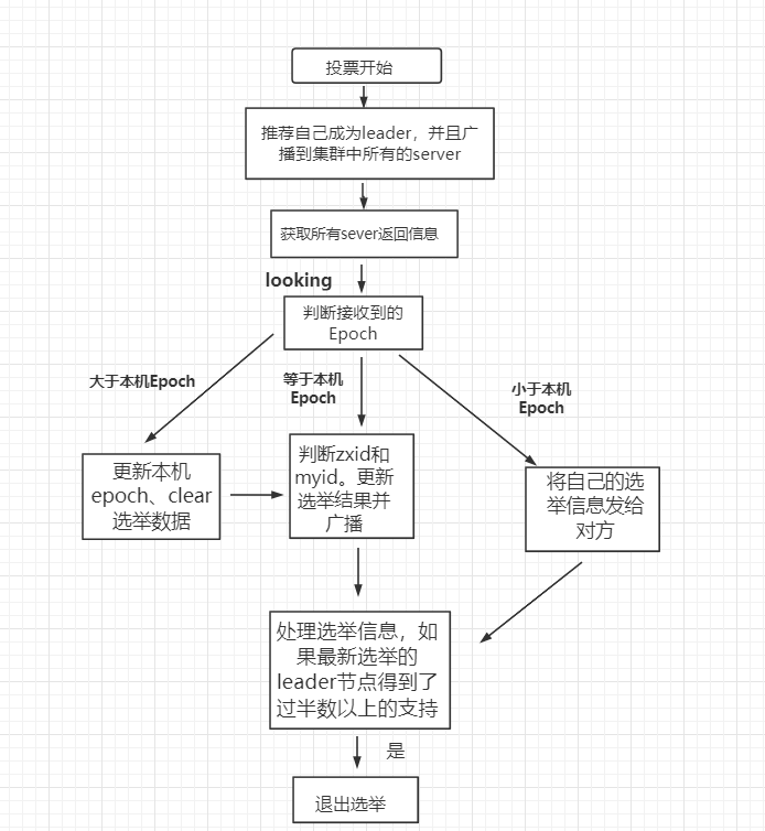 (2)接收来自各个服务器的投票。集群中的每个服务器收到投票后,首先判断该投票的有效性,如检查是否是本轮投票(epoch)、是否来自 LOOKING 状态的服务器。