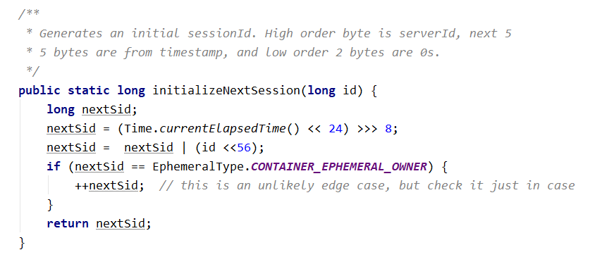 sessionID: 会话ID,用来唯一标识一个会话,每次客户端创建会话的时候,zookeeper 都会为其分配一个全局唯一的 sessionID。zookeeper 创建 sessionID 类 SessionTrackerImpl 中的源码。