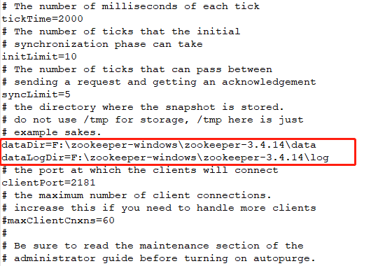 修改 zoo.cfg 配置文件,将 dataDir=/tmp/zookeeper 修改成 zookeeper 安装目录所在的 data 文件夹,再添加一条添加数据日志的配置(需要根据自己的安装路径修改)。