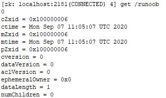 runoob 节点是在我们之前章节创建,并且通过 java 客户端设置值 0,现在我们在命令行终端执行 get /runoob 显示此节点的属性。
