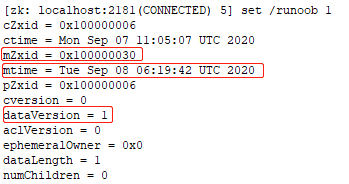 对比上面结果,可以看到 mZxid、mtime、dataVersion 都发生了变化。
