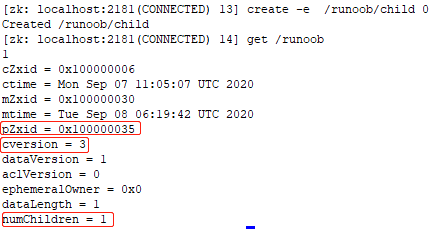 可见 /runoob 节点的 pZxid、cversion、numChildren 都发生了相应的改变。